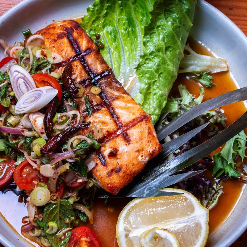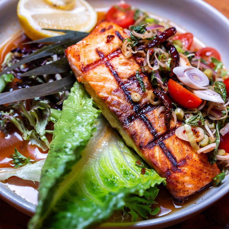 Seared salmon fillet topped with spicy lime dressing mixed with varieties of herbs.