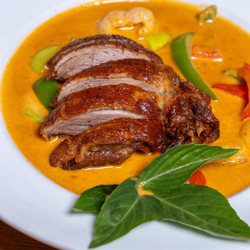Roast duck in red curry with cherry tomato, pineapple, lychee, bell peppers, green apple, and basil.