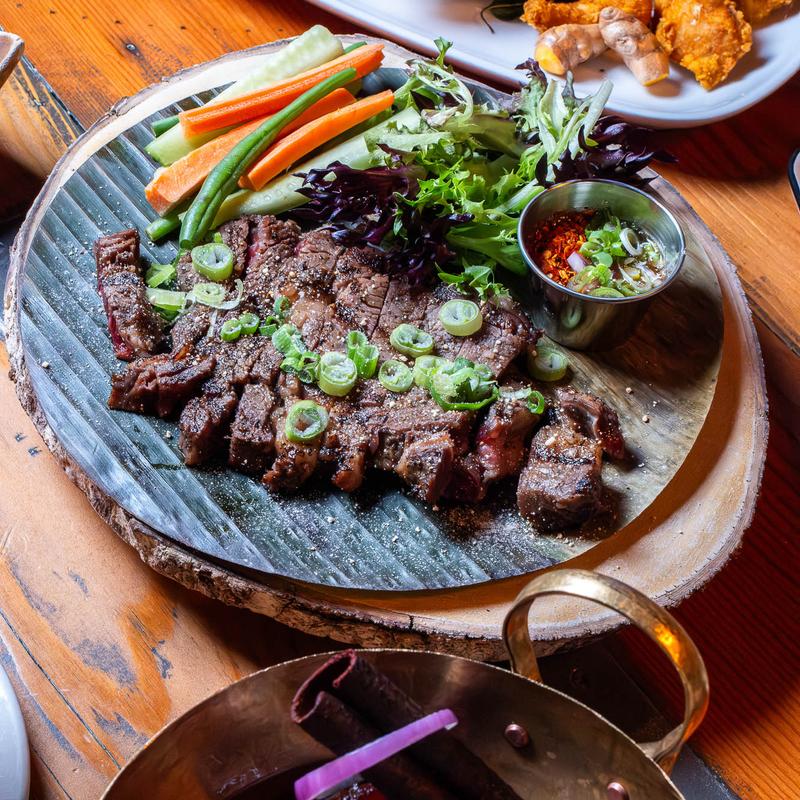 Grilled Marinated Flat Iron Steak served with Jaew dipping sauce and sticky rice.