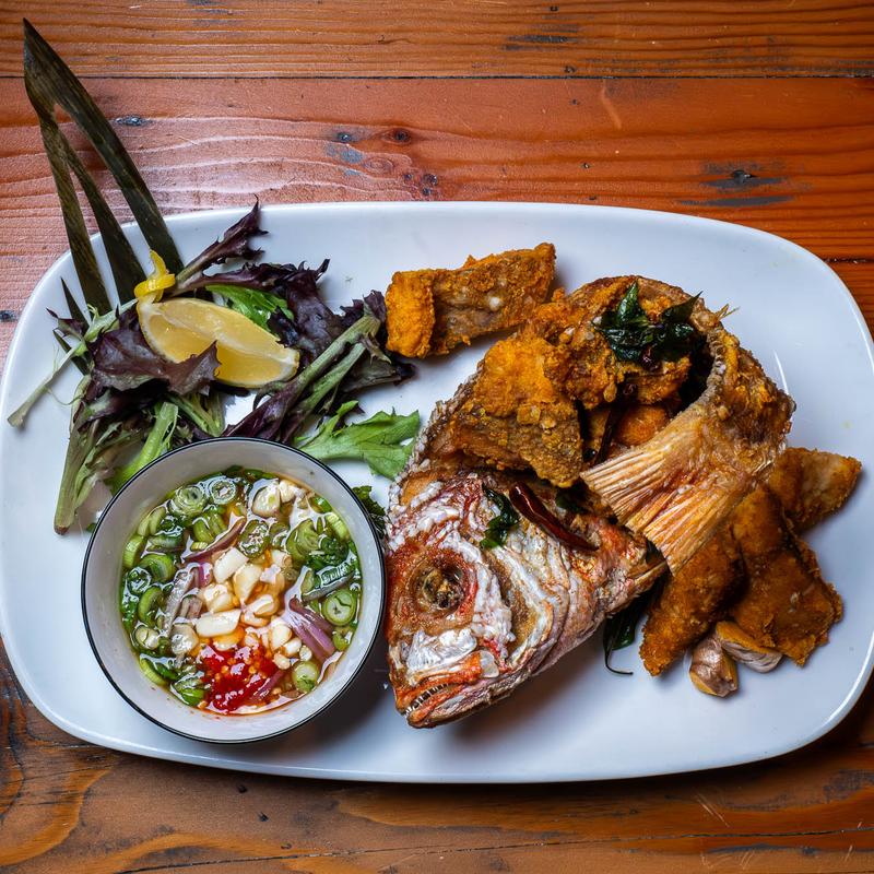 Deep-fried turmeric-rubbed whole red snapper served with spicy seafood sauce.