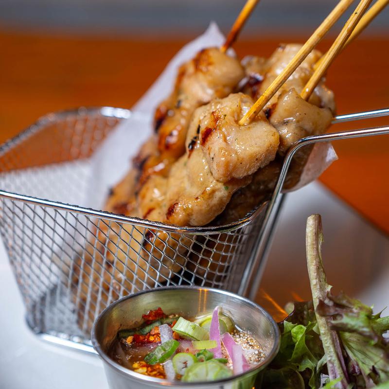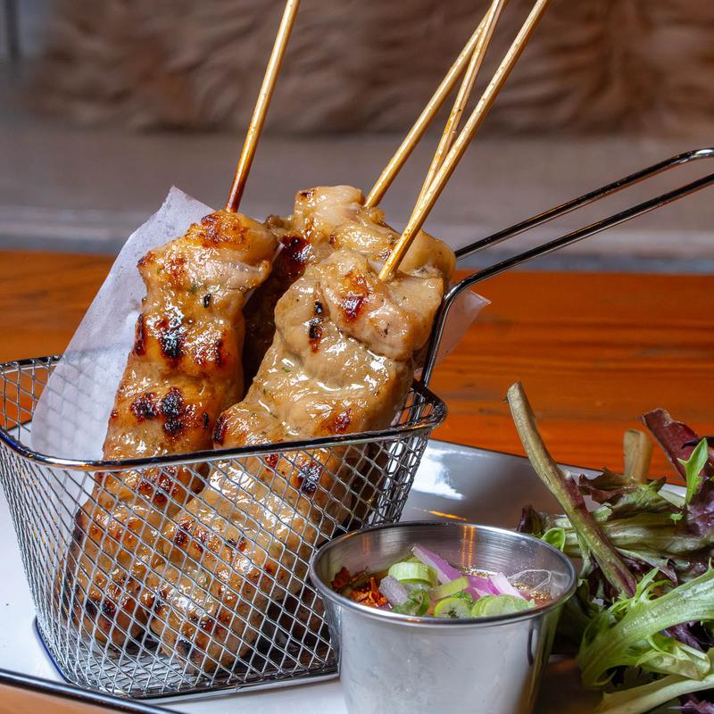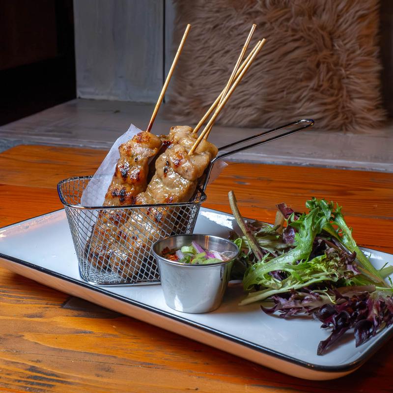 Old-fashioned and original grilled marinated pork satay served with chunky-curry peanut sauce, toast, and pickled cucumber.